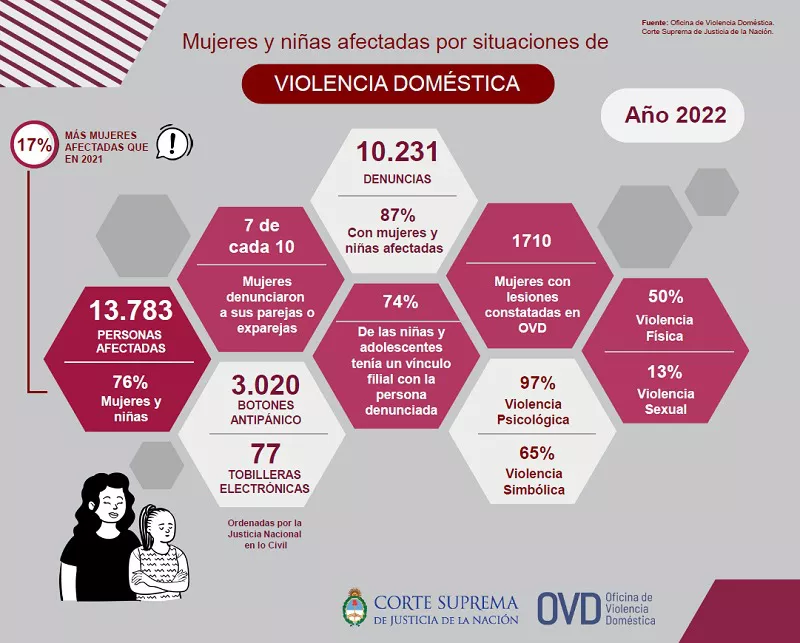 (LNMañana) Unas 13.783 personas estuvieron afectadas por hechos de violencia doméstica durante 2022, el 76% eran mujeres de todas las edades, lo que representa un incremento del 17% respecto del año anterior, informó la Oficina de Violencia Doméstica (OVD) de la Corte Suprema de Justicia de la Nación.